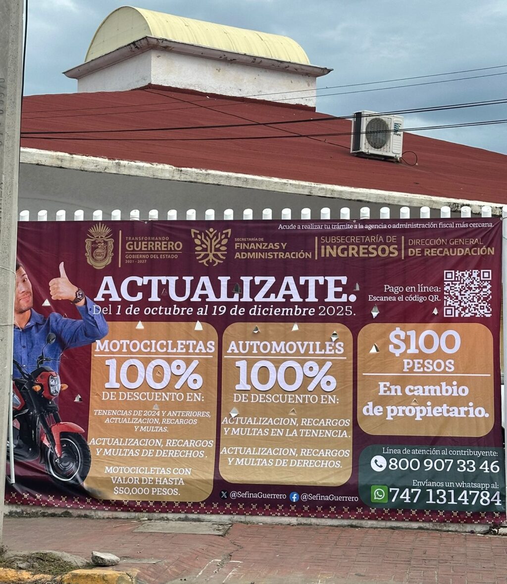 Del 1 de octubre al 19 de diciembre de 2025, el Gobierno del Estado de Guerrero, a través de la Secretaría de Finanzas y Administración, ofrece descuentos del 100 % en recargos, actualizaciones y multas relacionadas con tenencias y derechos vehiculares, en Zihuatanejo.