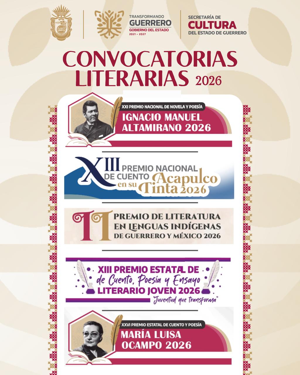 Dentro de las convocatorias estatales se encuentra el XIII Premio Estatal de Cuento, Poesía y Ensayo Literario Joven “Juventud que Transforma”, dirigido a jóvenes guerrerenses de 18 a 30 años, con un premio de $12 mil pesos en cada categoría. Por último, el XXVI Premio Estatal de Cuento y Poesía “María Luisa Ocampo”, para escritores guerrerenses o radicados en el estado con por lo menos tres años de residencia, otorgará un premio de $40 mil pesos en cada categoría. Ambas convocatorias cierran el 7 de agosto.