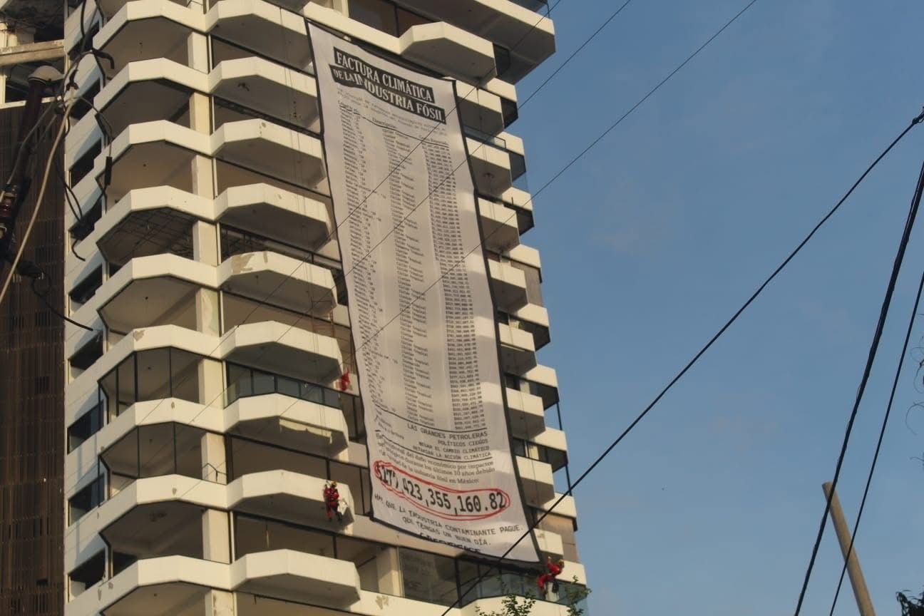 La mañana de este martes, cuatro integrantes del colectivo ambientalista colocaron la enorme lona que simula una factura con un monto superior a 177 mil millones de pesos, cifra que —de acuerdo con Greenpeace— representa los daños ocasionados por los dos fenómenos meteorológicos más severos de la última década.