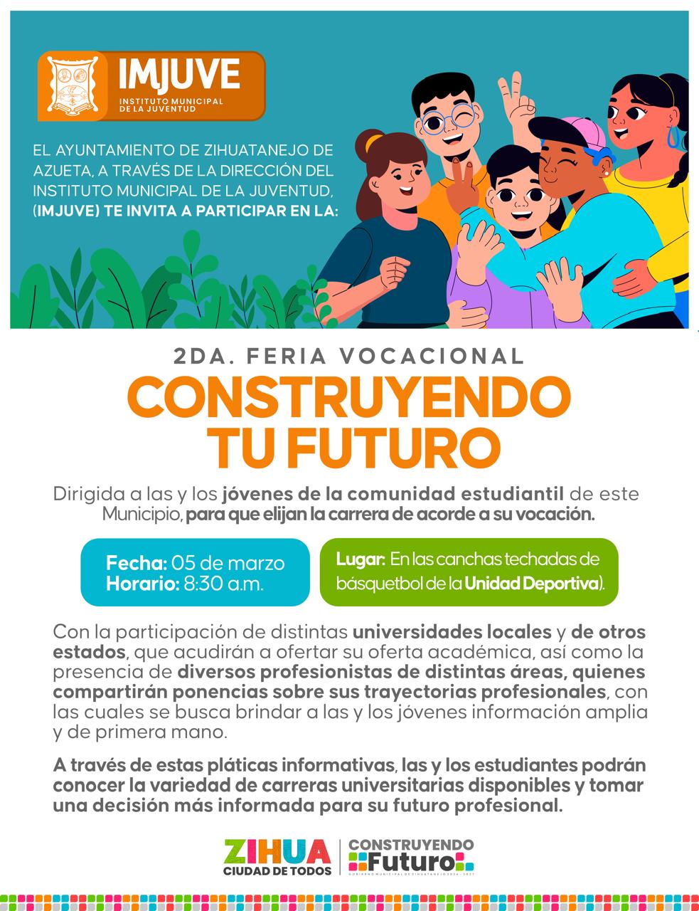 Zihuatanejo, Gro.– Con el objetivo de seguir impulsando la educación de los jóvenes y facilitarles la decisión sobre qué carrera estudiar, así como darles a conocer las opciones que ofertan diversas universidades, el gobierno que preside Lizette Tapia Castro, a través del Instituto Municipal de la Juventud (Imjuve), a cargo de José Ángel Irra Baños, llevará a cabo la Feria Vocacional este jueves 5 de marzo en las canchas techadas de la Unidad Deportiva, a partir de las 9:00 de la mañana.