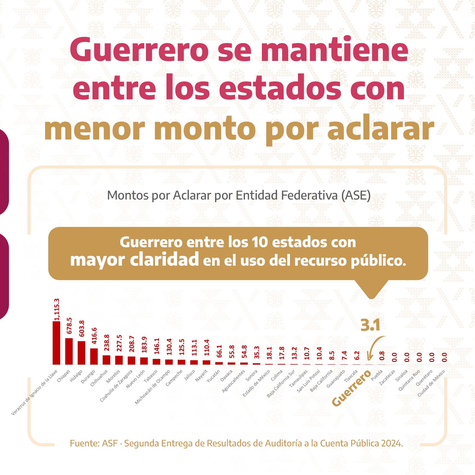 En la segunda entrega del informe ante la Cámara de Diputados, la Auditoría Superior de la Federación destaca a Guerrero con solo 3.1 millones de pesos por aclarar, cifra que lo coloca entre los diez estados del país con mayor claridad y rendición de cuentas en el manejo del gasto público.