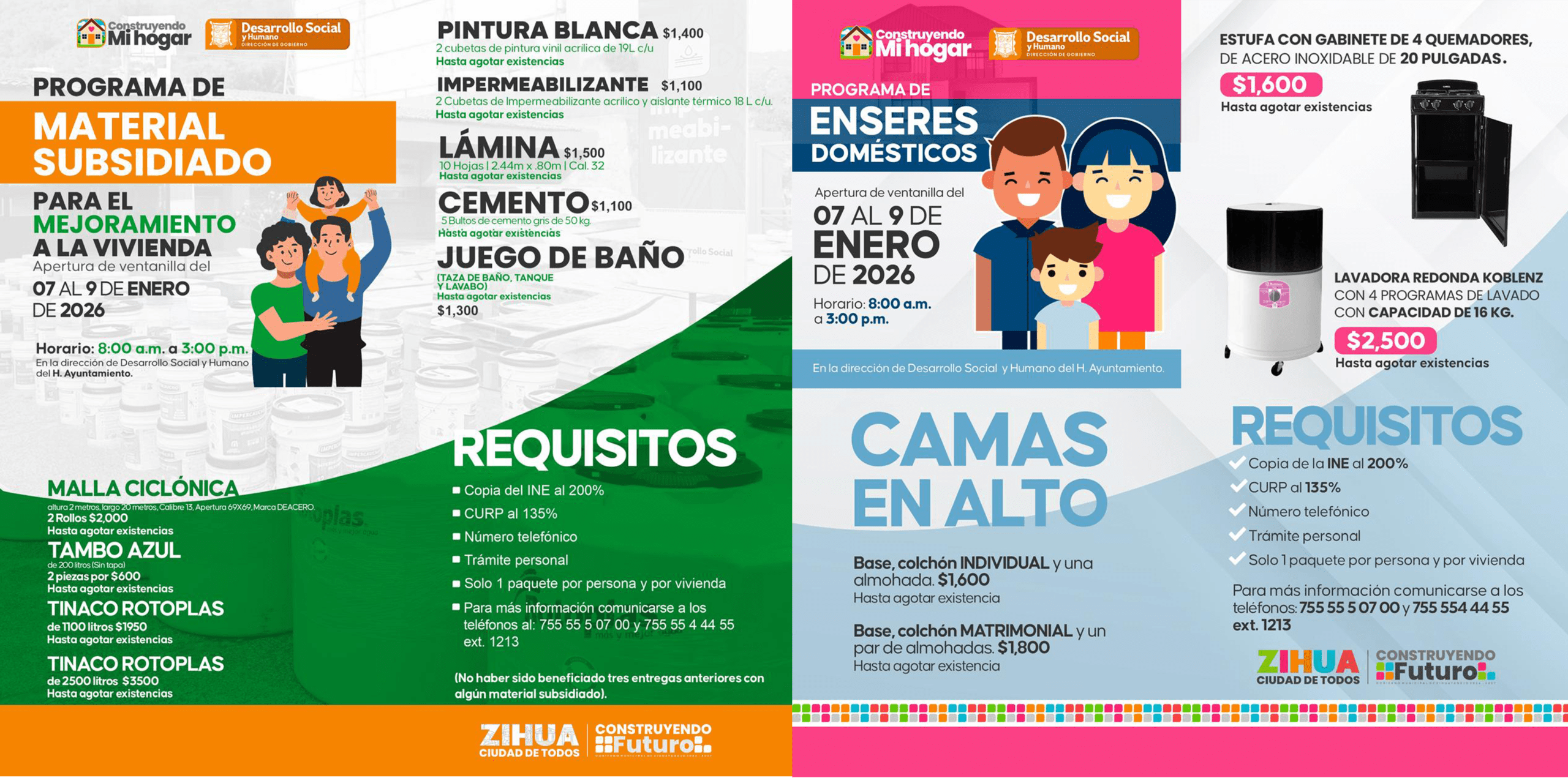 Bernardo Benjamín Sánchez, director de Desarrollo Social y Humano y coordinador del mencionado programa, dio a conocer que desde este miércoles 7 se abrió la ventanilla para la recepción de documentos de las personas interesadas en adquirir productos como cemento, tinacos de 1,100 y 2,500 litros, lámina galvanizada, malla ciclónica, pintura blanca, impermeabilizante, WC con herrajes y lavabo; además de enseres como bases para cama individual y matrimonial, con colchón y almohadas, estufas y lavadoras, a precios subsidiados al 50 % por parte del gobierno municipal.
