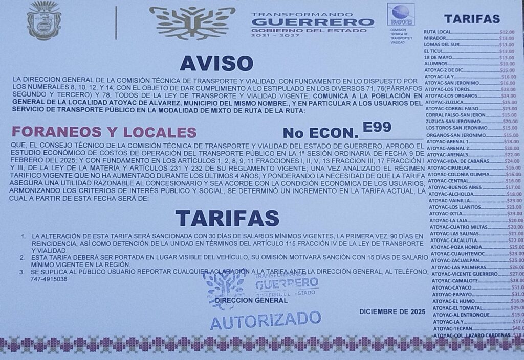 Tecpan, Gro.- El delegado regional de Transportes, Ernesto Alonso Téllez Peñaloza, advirtió que los conductores del transporte público que no respeten ni exhiban de manera visible las nuevas tarifas autorizadas serán sancionados conforme a la normatividad vigente.