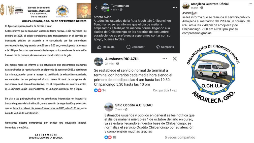 Entre los sitios y rutas que confirmaron el restablecimiento de corridas se encuentran Mochitlán–Chilpancingo, la Organización de Choferes Unidos de Amojileca, los Autobuses Río Azul (Colotlipa–Chilpancingo) y el Sitio Ocotito A.C., los cuales retomarán operaciones normales a partir de este miércoles 1 de octubre.