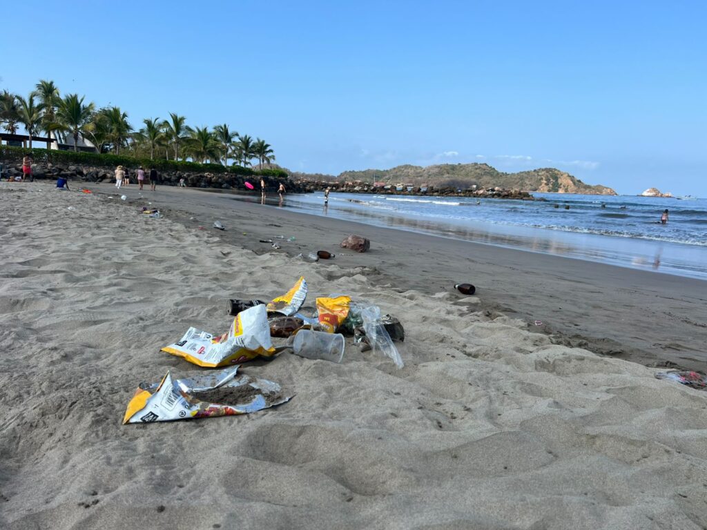 A pesar de existir contenedores de basura instalados en los accesos principales, los residuos fueron abandonados sobre la playa; incluso algunos entraban en contacto con el oleaje cerca de las 9:00 de la mañana de este viernes.