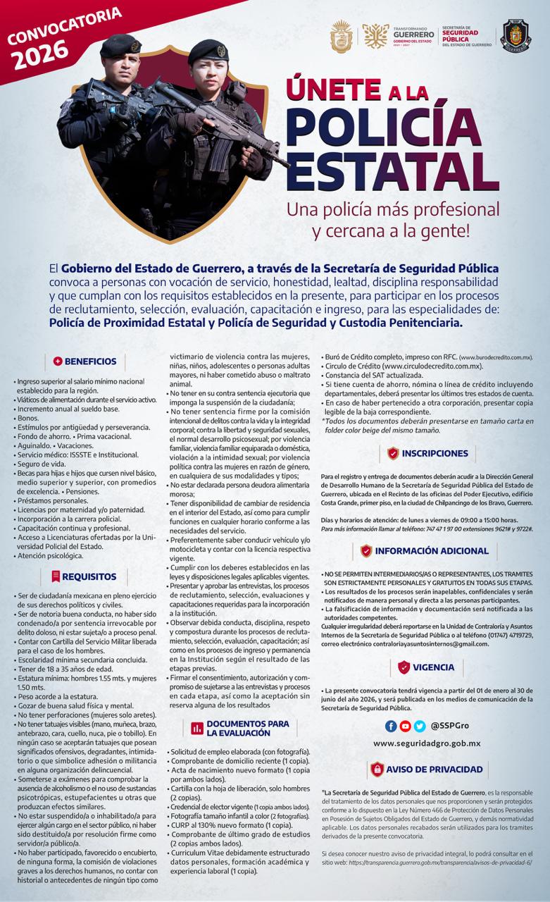 Chilpancingo, Gro.— Para seguir fortaleciendo la cultura de paz y el compromiso con la seguridad, el Gobierno de Guerrero, a través de la Secretaría de Seguridad Pública estatal, anuncia la apertura de su Convocatoria 2026.